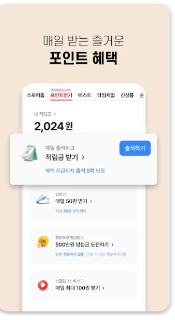 • 출석체크, 만보기, 행운번호 등 다양한 포인트 적립 기능