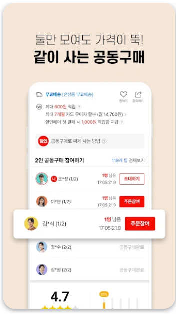 • 공동구매에 참여하면 둘 이상의 구매자와 함께 더 저렴한 가격으로 구매할 수 있습니다.