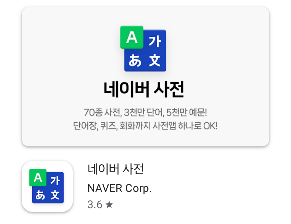 1. 안드로이드는 구글 플레이스토어에서 ‘네이버 사전’을 검색 후 설치합니다.