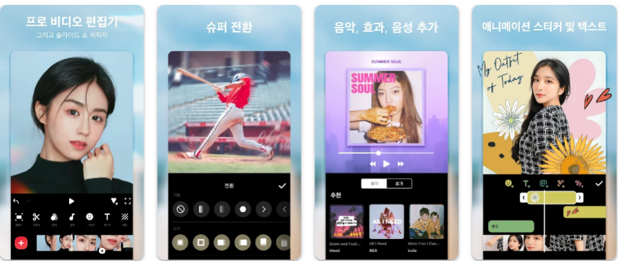 - 스티커·자막·스톡 영상: 5,000개 이상 스티커와 트렌디한 폰트, 무료 스톡 영상 사용 가능