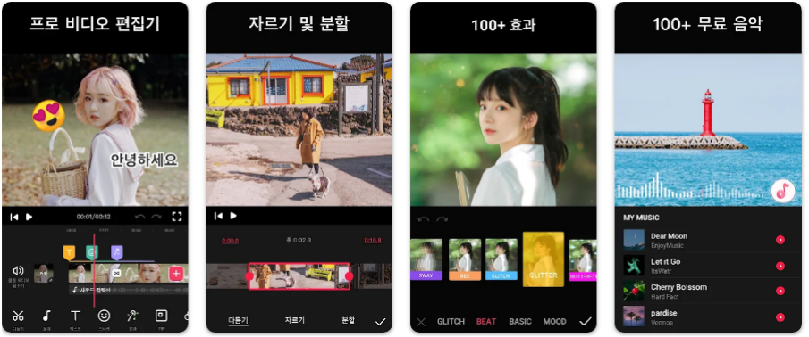 - 틱톡 스타일 효과: VHS, glitch 등 50개 이상의 효과 제공