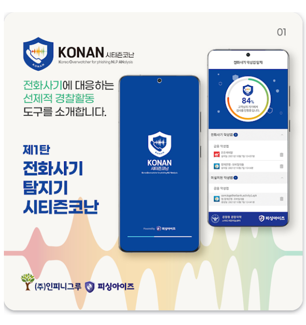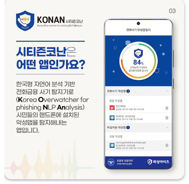 시티즌코난(Citizen Conan)은 보이스피싱, 스미싱, 악성 앱 탐지를 위해 경찰청 협조 하에 개발된 스마트폰 보안 앱입니다. 특히 카카오톡 사칭 메시지나 악성 앱으로 위장한 원격 제어 앱 설치를 감지하고, 사용자 몰래 실행되는 악성 코드를 실시간으로 차단하는 기능이 탑재되어 있습니다. 스마트폰에 설치 후 백그라운드에서 자동으로 감시하는 구조로, 사용자의 별도 조작 없이도 보안 상태를 유지할 수 있는 것이 특징입니다.