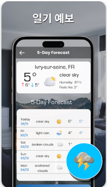 • 앱 설치 후 최초 실행 시 위치 정보 접근을 허용해야 외부 날씨 데이터를 제공받을 수 있습니다.