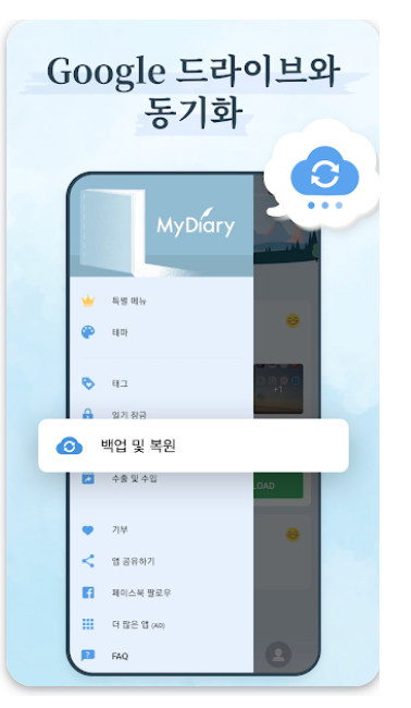 • 일기 데이터의 백업과 복원이 쉬워 휴대폰 변경 시에도 문제없이 데이터를 이전할 수 있습니다.