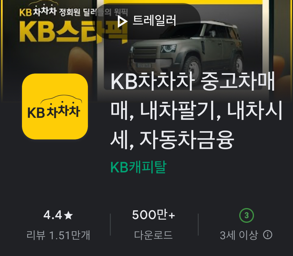 KB차차차 앱은 KB금융그룹 계열사인 KB캐피탈에서 운영하는 공식 자동차 플랫폼입니다. 국내 최대 규모의 중고차 거래 플랫폼 중 하나로, 중고차 매물 검색, 내차팔기, 시세조회, 자동차 금융까지 자동차와 관련된 전 과정을 통합 지원합니다.