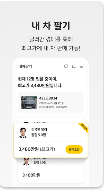 • 내 차 팔기: 팔아줘차차차 서비스를 이용해 여러 딜러가 경쟁입찰을 진행하고, 최종 입찰가를 확인한 후 판매 여부를 선택할 수 있습니다.