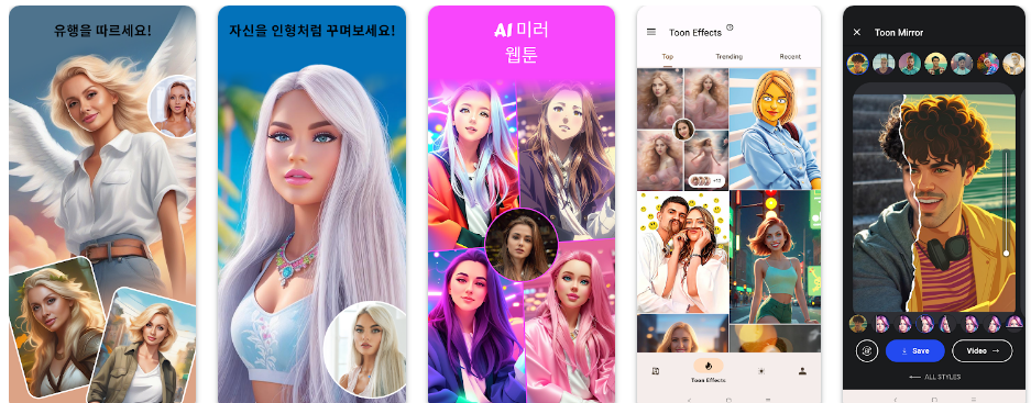 툰앱은 AI 기술을 활용해 사진을 만화 스타일로 바꿔주는 편집 앱입니다. 얼굴을 강조한 캐리커처 제작과 다양한 만화 필터, 애니메이션 효과를 적용할 수 있어 개성 있는 이미지를 쉽게 만들 수 있습니다.